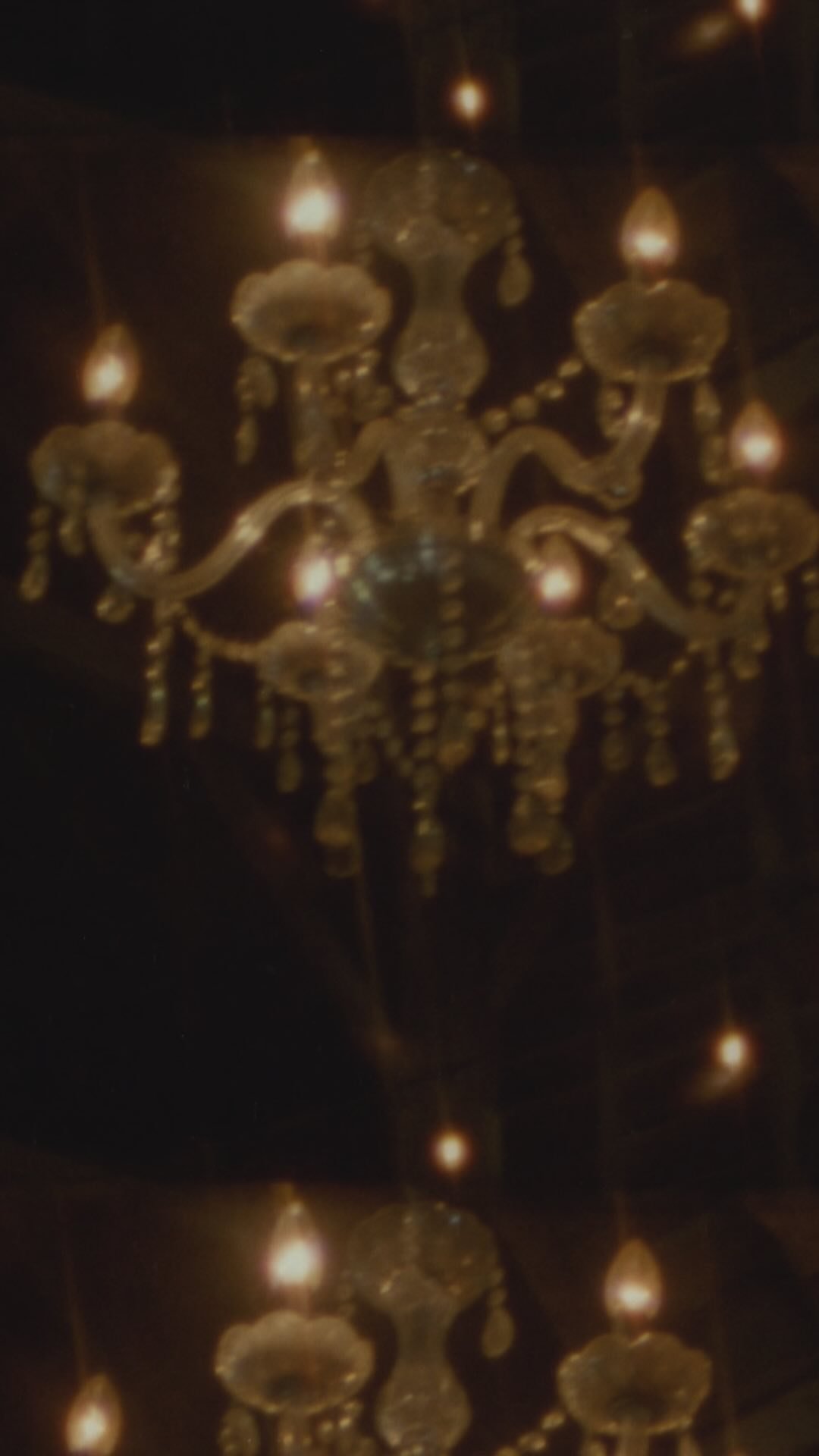 A chandelier hanging from the ceiling with multiple lit candles, reflecting softly in a mirror.